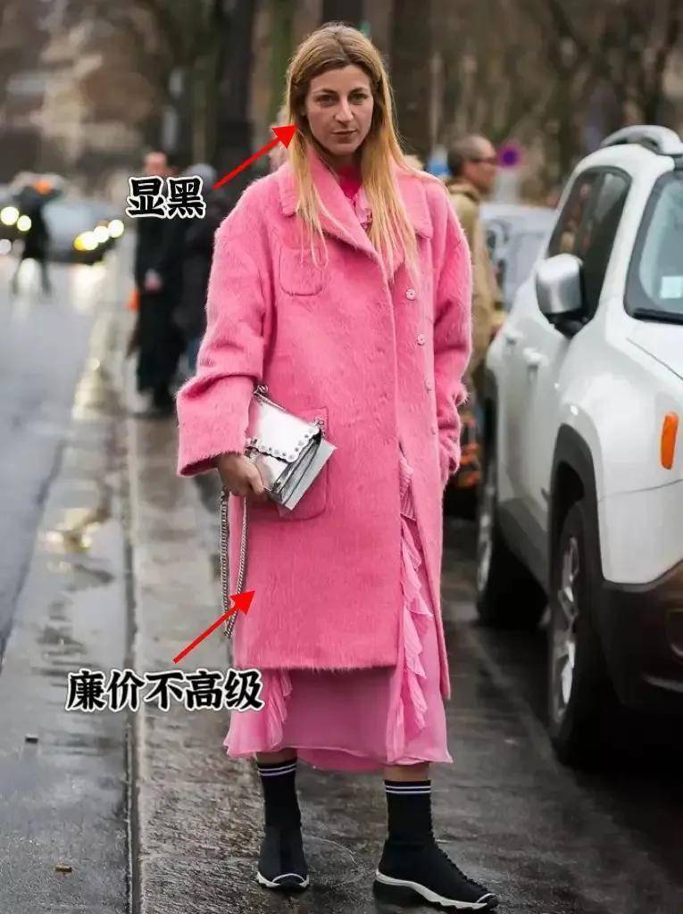 粉色衣服天然好意思瞻念,然而当你全身齐是这个色调,致使加上红色的毛衣,这么的配色会使东说念主显黑,全体造型不高档,村炮低价。