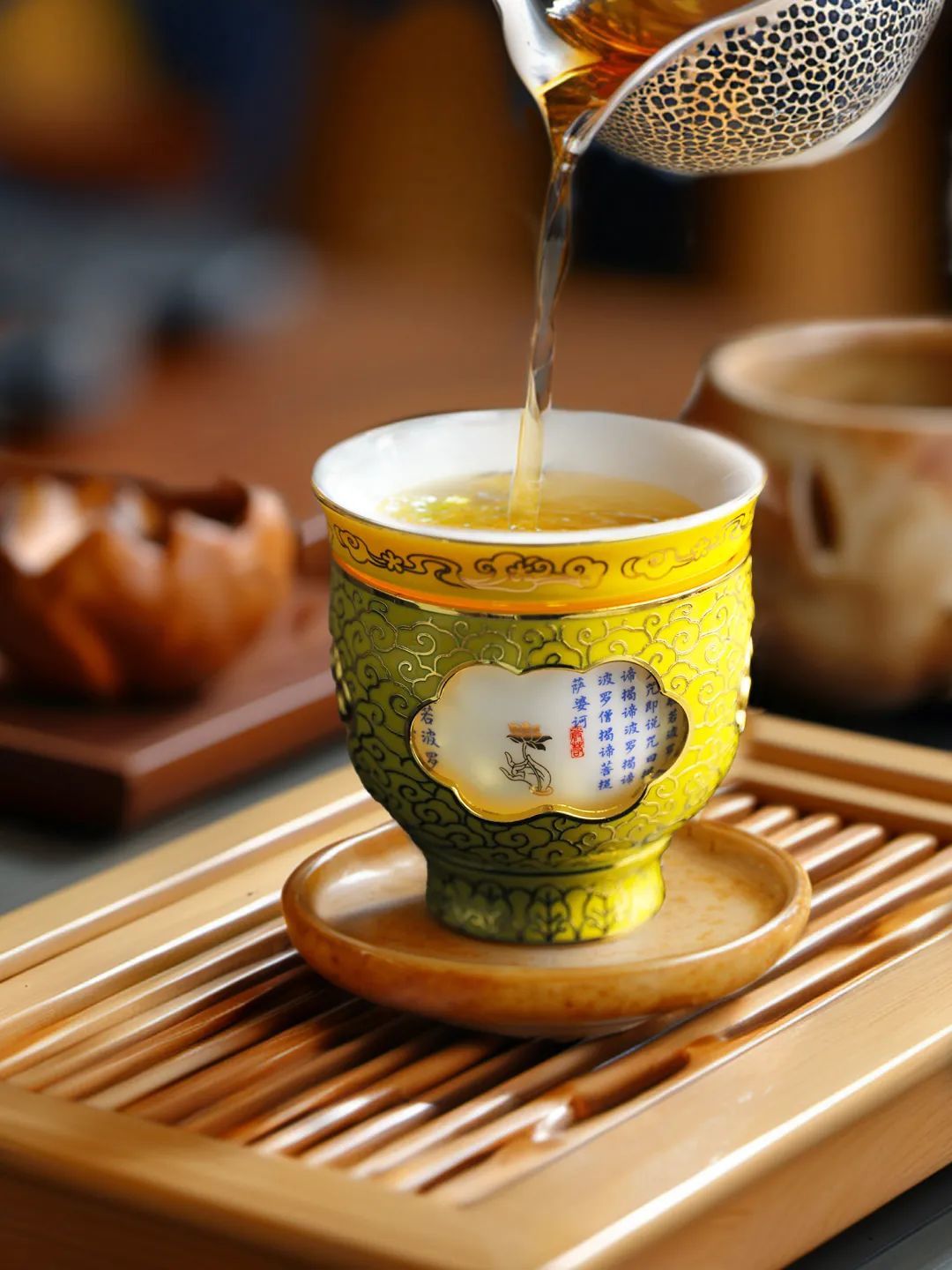 外杯遴荐景泰蓝工艺,内杯藏有心经,动掸杯身仿佛在转经筒祝福。