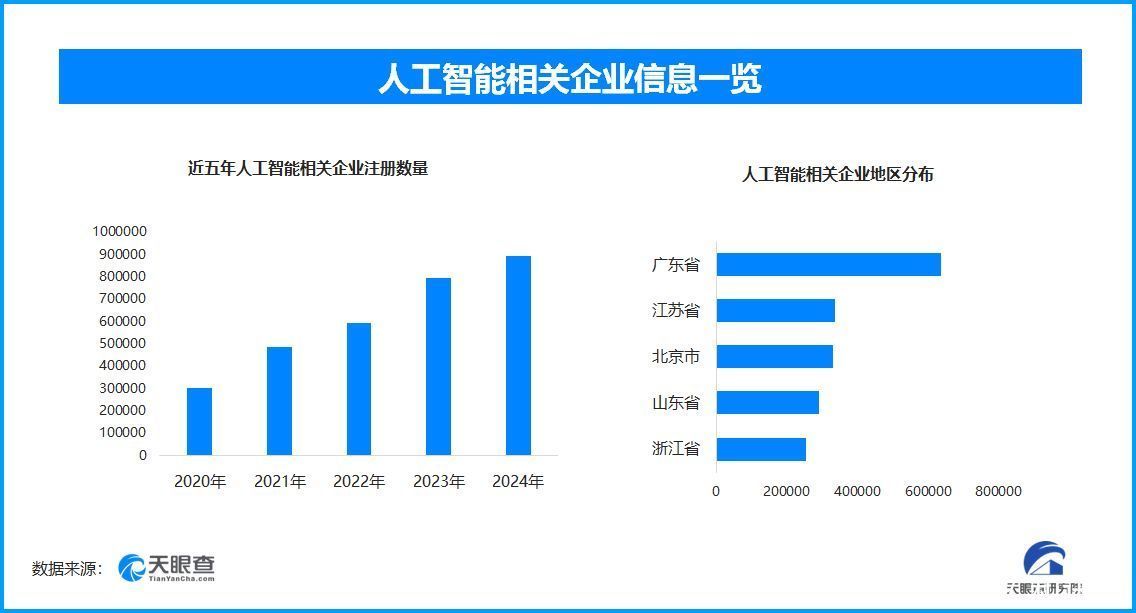 从区域分散来看,广东省以跳跃63.6万余家的东说念主工智能关系企业数目位居首位,占宇宙企业总额的15%;排在后来的是江苏省、北京市、山东省和浙江省,关系企业数目区分是跳跃33.6万余家、33.1万余家、29.2万余家和25.2万余家。