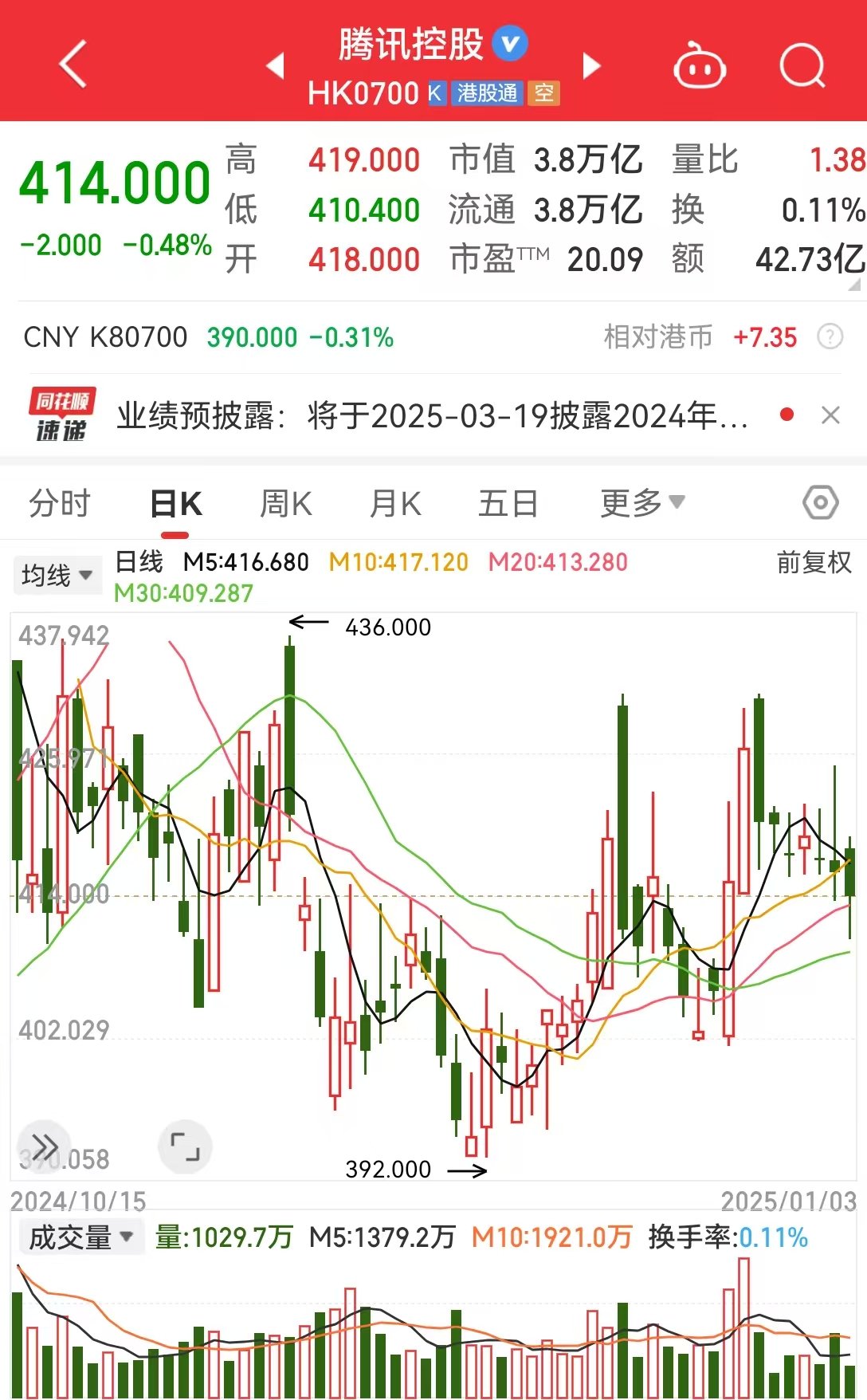 鸿沟发稿,腾讯控股(HK0700)报414港元,跌幅0.48%,市值3.8万亿港元。