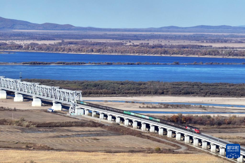 10月16日,满载入口物质的货色列车通过同江铁路大桥驶向中国铁路哈尔滨局集团有限公司同江北站(无东谈主机像片)。新华社发(吴雨南摄)