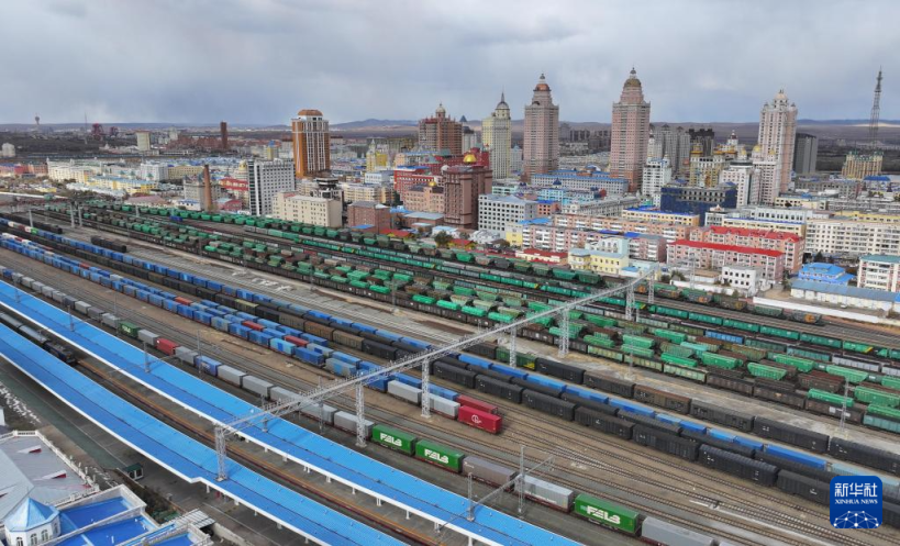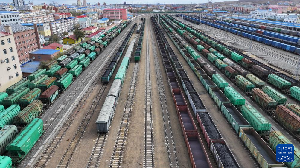 10月18日,在中国铁路哈尔滨局集团有限公司满洲里站编组场,中欧班列及番邦货色列车在恭候取送车功课(无东谈主机像片)。新华社发(黄旭摄)